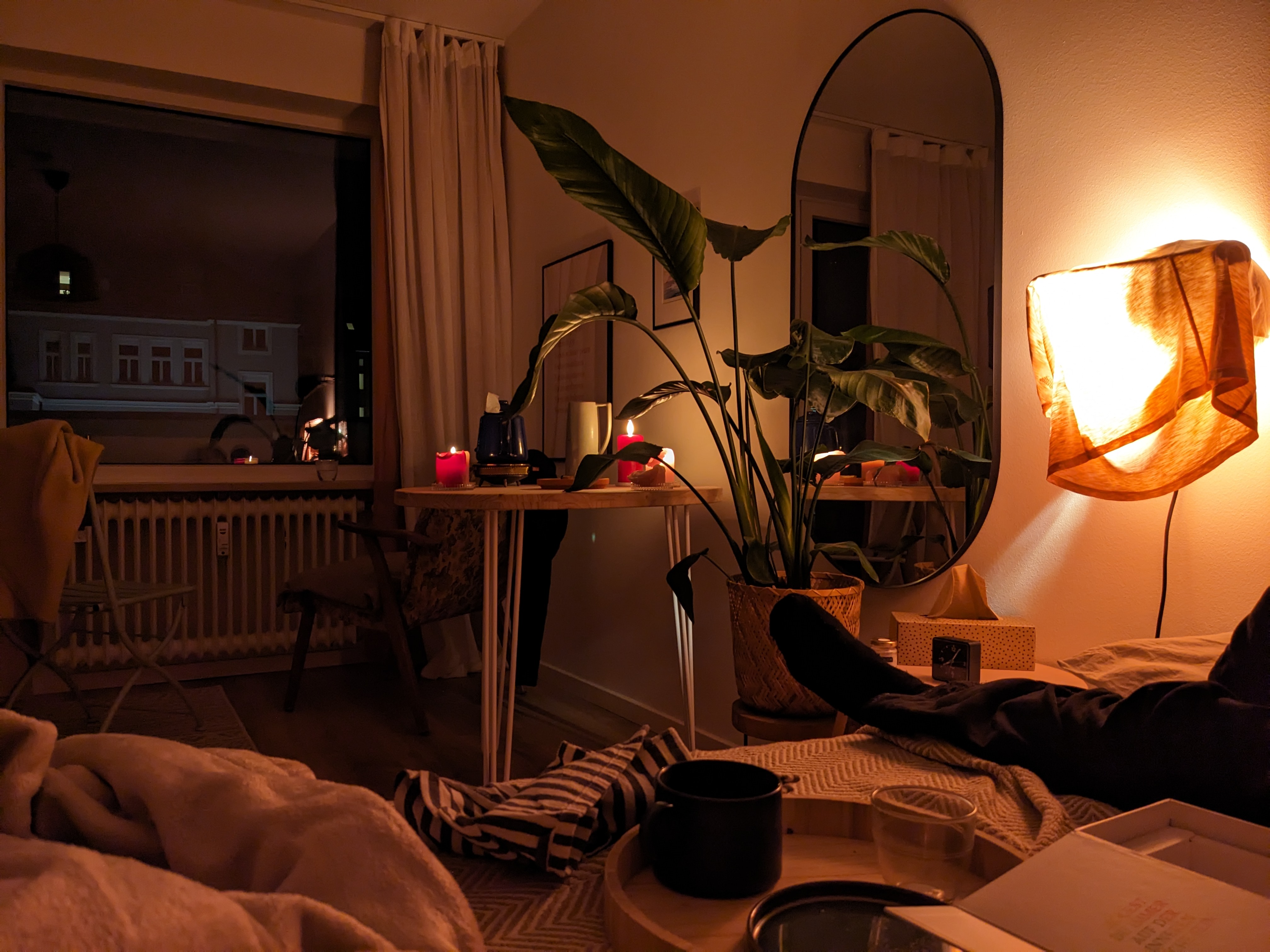 Für eine kleine Weile lebe ich in dem Appartement einer Freundin in der Stadt mit einem rosa Kühlschrank und einer Fensterbank, auf der ich esse, lese, die Beine hochziehe und in die Sonne schaue, wenn sie scheint. Meine Arbeitshaltung verändert sich weiter. Wenn ich flach atme, halte ich inne und verlangsame das Tempo. Die Ergebnisse werden unwichtiger, meine Verfassung geht vor. Ich übertreibe es völlig mit dem Kerzenlicht in diesen Ausläufern des Winters und lasse einen nicht geringen Betrag meines Freizeitgeldes in den Drogeriemärkten dieser Stadt, um Nachschub zu gewährleisten. Abends ummantelt mich die turmalinblaue Dämmerung, das Unendliche im Endlichen, ich bin in meinen Gefühlen reich.